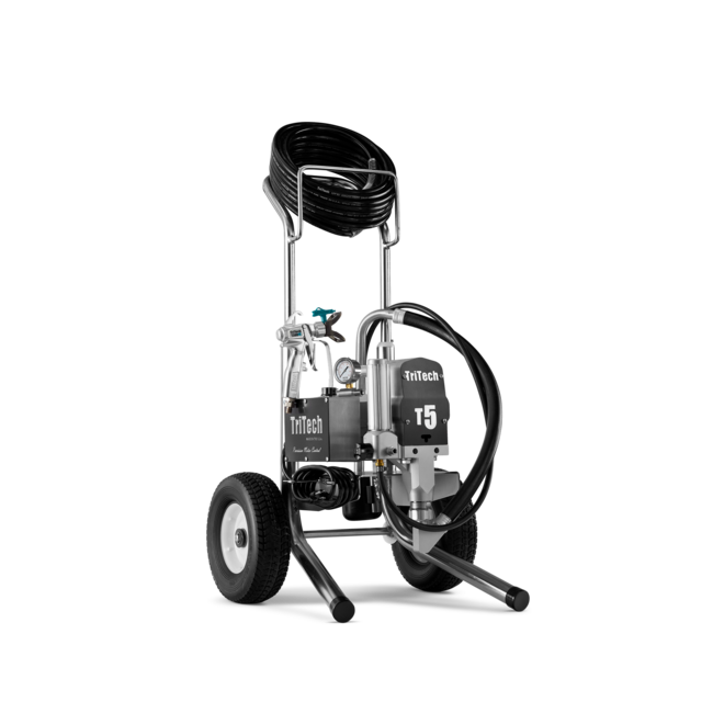 De Tritech T5 is een airless elektrische plunjerpomp en geschikt voor verspuiten van viscose coatings.