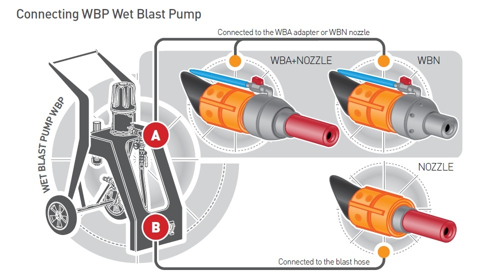 De WBP natstraalpomp is de betrouwbare oplossing voor stofvrij zandstralen. Bij het natstralen wordt het straalmiddel bevochtigd voordat het het oppervlak raakt, waardoor tot 92% minder stof ontstaat. De WBP natstraalpomp biedt twee oplossingen voor natstralen: de WBP natstraalpomp aansluiten tussen de straalketel en de straalslang; of de WBP natstraalpomp aansluiten op het WBA-opzetstuk/WBN-mondstuk.