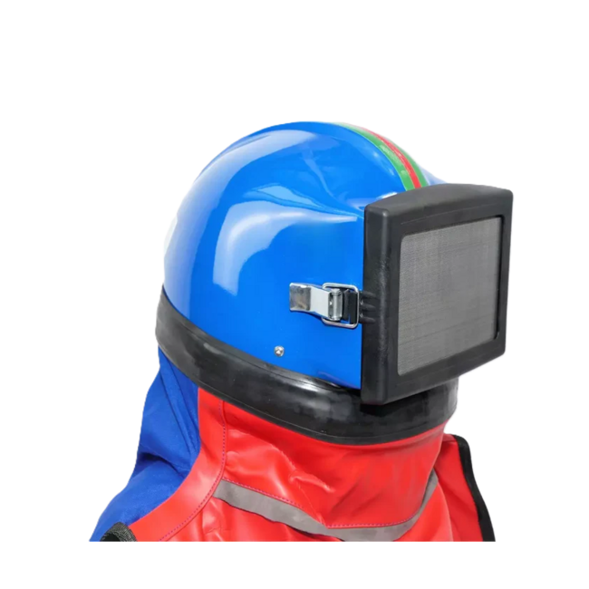 Deze kwalitatief hoogwaardige straalhelm is uitgevoerd met een regelkraan, luchtstroomindicator en zware PVC pelerine met riem.